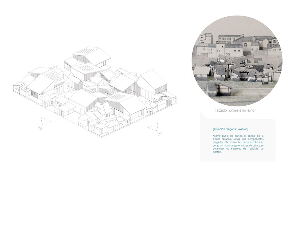El resto del espacio se organizaría de una forma completamente nueva. Una especie de puzle gigante donde esas tipologías antes mencionadas se iban colocando como piezas que encajaban en una única posición: aquí estaba la cocina estacional (a la que se le puso el nombre de Sede de la Bienal Gastronómica). Y que precisamente era estacional porque funcionaba de manera distinta según la época del año. Habitualmente la posición del edificio era una, pero mientras duraba la Bienal, esa semana o ese mes, cuando llegaba la primavera, los pequeños módulos se desplazaban y configuraban una posición diferente, casi antagónica.