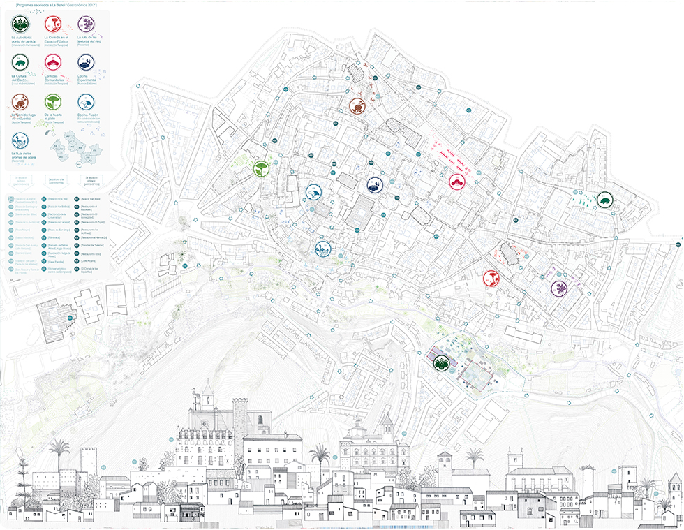 Definida la huerta de Tenerías como punto de partida y enclave idóneo para localizar el espacio donde tendría lugar la nueva sede de la Bienal Gastronómica de Cáceres, me dispuse a trabajar de forma más intensa en su orografía, su relación con el barrio del arrabal y el casco histórico, y en un programa gastronómico y cultural que se distribuyera por los espacios públicos más importantes del entorno.